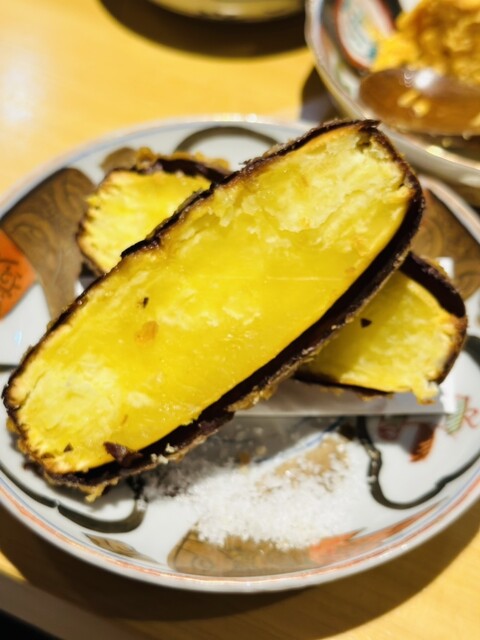 さつまいもは生からじっくり揚げていくので、中までほっくり、そしてパリパリの皮も美味しいから、荒めのお塩でどうぞ♪