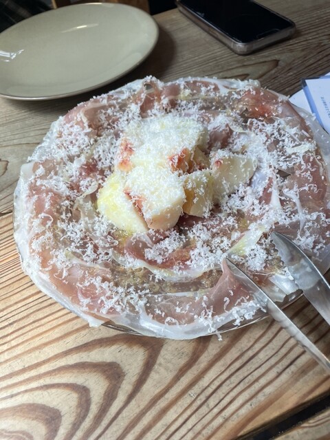 生ハムと桃、冷静スープ、ピザ、ペペロンチーノ絶品でした。