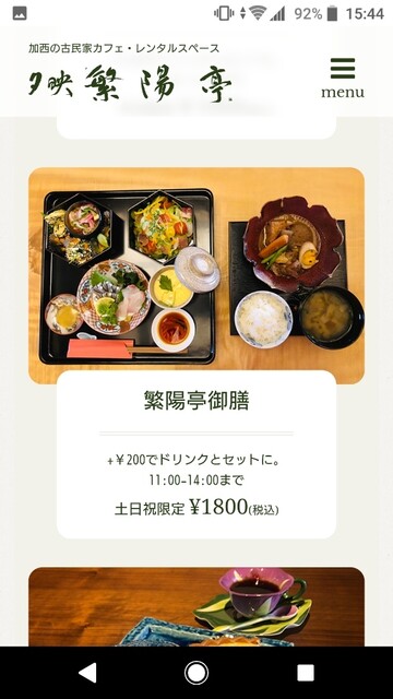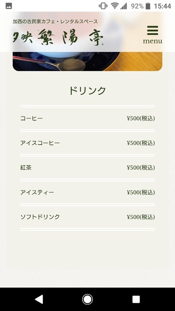 古民家カフェ 夕映 繁陽亭 お品書き (表示価格は税込)