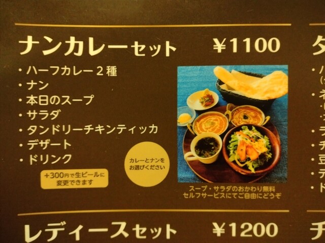 ✸ハーフカレー2種・ナン・本日のスープ・サラダ・タンドリーチキンティッカ・デザート・ドリンク
