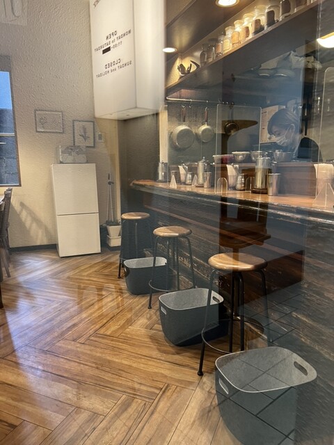 席数はカウンター席3、テーブル席4人×2、2人×1。テーブル席は相席。
