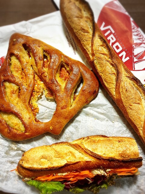 どうしてもVIRONのハード系のパンを食べたくて、定時で上がりました。時刻は17:30過ぎ。パンが残っているか心配でしたが、ありました❗️大好きなプーレロティ。超ハードなバケットに主にたっぷりなチキンとキャロットが挟んであります。これはいつも息子と半分こ。もうひとつのお目当て、フーガスグリュイエールは完売だったので、フーガストマトを購入。その代わり、エピラルドン(エピの中にアンチョビフィレが入っていて、上にチーズを乗せて焼いてある)を。小さい時、母がよく焼いてくれたブリオッシュも購入です。定番のバケットも忘れずに。こちらはお店の雰囲気がまるでパリにいるような素敵な外観と内装です。平日夕方、外の席でひとり食事を楽しむ女性も多かったです。たまにはそういうのも良いですよね。私はパンを受け取ったら東京駅に急いで向かいましたが…
