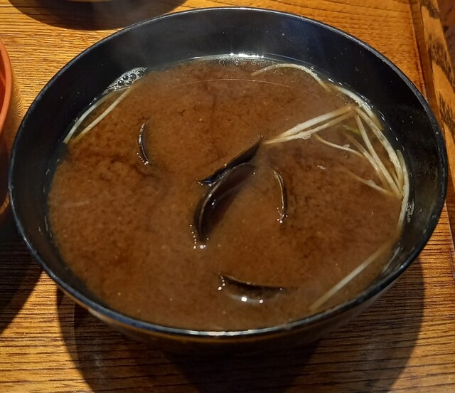 漬物。浅利の味噌汁。小海老のかき揚げ天丼。