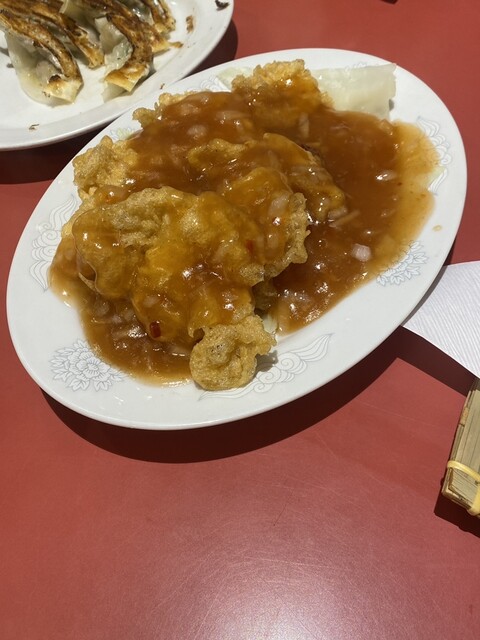 餃子3人前、天津飯、炒飯、レバ炒め、エビチリ、鶏の唐揚げなど注文。