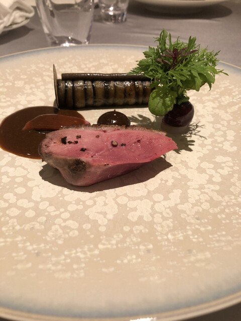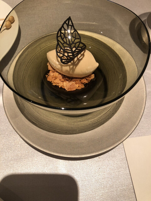 このお店はどう行けば近いのかな?どこからも近くて遠い東京証券所の横です。近くには最近パティスリーeaseやショコラトリーなどもあり新進気鋭の料理人が集まる場所になっています。エントランスはイマイチですが中は広々としており、白と銀を基調とした店舗は大変素晴らしく、流石グランメゾンです。サービスマンもたくさんいて、皆さん細やかで気が利きます。ただ、慌ただしさも感じたのでこれは好みの問題でしょう。料理の説明は危なげなく丁寧でした。ただ、やはりドリンクメニューがないのと、値段がわからないのは怖いですね。個人的にはお値段はあがり1000円でも払いますけど知りたい。ちなみに食前のスパークリングワイン2200円でした。ズバッと聞いちゃいました。おばちゃんですからね。でも、聞くの全部やりたくないから(さすがにできない)明朗会計になるといいな。それか、気にならないほどの富豪になりたい。料理は素材を活かす料理で絶品。まず、フォトジェニックでメルヘンなルックス。アリエッティみたいな世界のサラダだったり。雪に見立てたホワイトチョコレートを掘るとフルーツが輝くようなデザートだったり。本当に楽しく手がこんでいて美味しかったです。鴨のローストは2種のソースで食べるんですが鴨のささみ部分がめちゃくちゃ柔らかくて溶けます。すごい料理でした。残念なのは、ミニャルディーズだけイマイチでした。カヌレもマカロンも大好きなんですが、ここでもう一つびっくりできたら良かったかな。ミニャルディーズが美味しいフレンチのお店にまだ出会えてないので出会いがあるといいな、と来年の目標が出来ました。滞在時間2時間