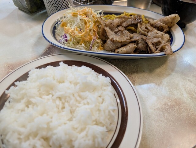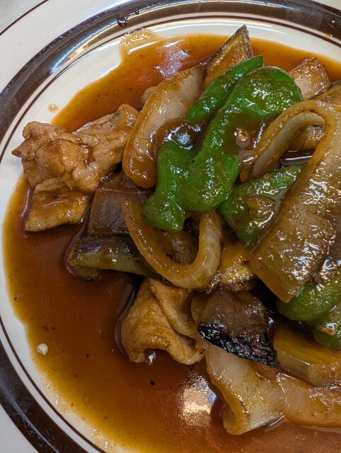 到着したランチは、豚バラ肉と思われる肉が、黒胡椒などで味付けされて炒められています。