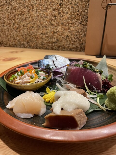 お刺身は白子ポン酢、鮪漬けの山かけ、カツオのニラ醤油、ホタテ、しめ鯖とそのお魚が1番美味しい食べ方で提供してくれるのが嬉しい!