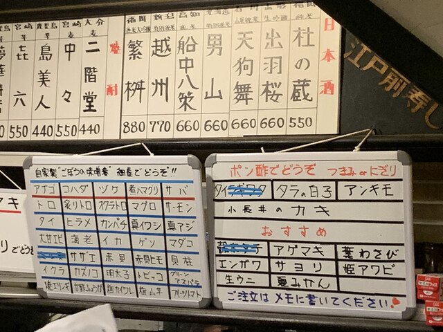 私は「薄めの」ハイボール、嫁さんはノンアルコールビールをまずは注文。それから大判の付箋にネタの種類を記載する。なんでも食べられる方は上や特上を注文し、それから個別に追加されるんでしょうが、一部食べられないものがある身としてはこのやり方以外にありません。