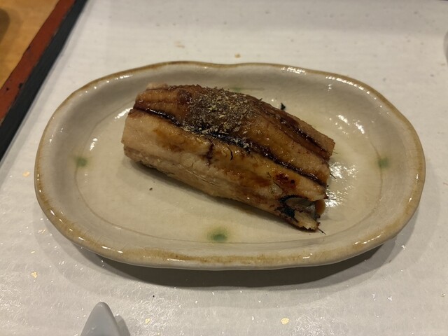 そのアナゴをさも愛おしそうに食べております。身がホロホロで、柔らかくて…箸でつまんだら崩れること間違いなしなので、そっと手づかみ。シャリとの一体感や味、全てが素晴らしい!