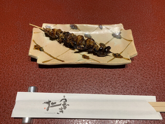最初に肝焼き串が提供されます。苦味と甘味、タレのバランスが絶妙で、思わず「ビールが飲みたい」と口走ってしまいました。思っていたより肝の数が多くて得をした気分です。山椒を少し振ると旨味が倍増します。