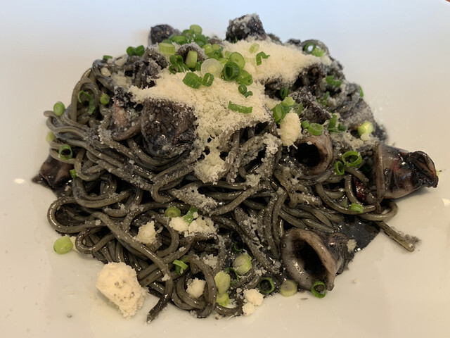 しかし、嫁さんは魚介OKなんですけれど、イカ墨の匂いと味わいがあまり好きではありません。その彼女が一口食べて「美味しい。全く嫌な感じがない。これなら美味しく食べれる。」と驚いたご様子。