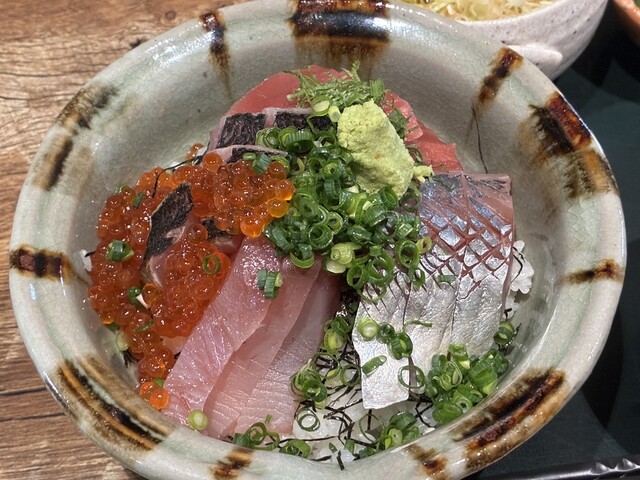 ということで、海鮮丼(酢飯・大盛りは無料)1200円、活アジフライ定食1000円を注文いたします。この段階でマヨがどうのと聞くのを忘れてました…サラダのドレッシングはマヨ無しかどうかは聞いたんだけど。