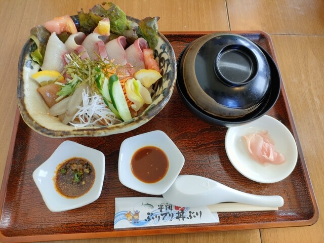 前回、連れが頼まなかった「ぶりプリ丼ぶり」を是非食べてもらいたいと思い再訪しました。土曜日のお昼ちょい過ぎ、これから混雑するような様子にて着席、はやる気持ちを抑えつつ「ぶりプリ丼ぶり」を二人前オーダー、暫し後着丼、盛り付け豪勢!スタッフさんの説明を聞いた後かぶり付く。