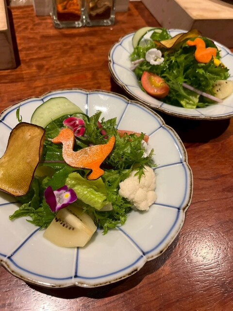 生、揚げ、蒸しなど多様な野菜が入っている、人参はあひるの飾り切りで見た目も可愛いサラダ