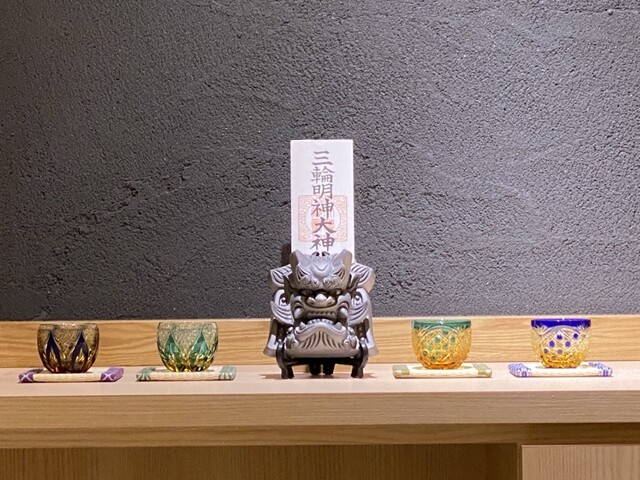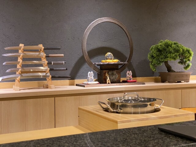 置物や盆栽など至る所にセンスの良さを感じます。御影石のモダンなカウンター、ゆったりと座れるお席は8席。事前に予約をし平日の12時にお伺いしました。予約は一週間先でないと取れない状況で、電話予約が必須です。