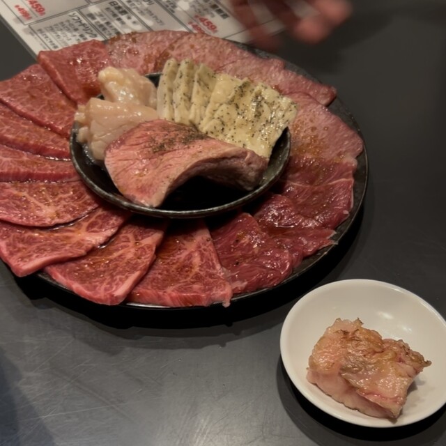 牛ヒレ肉の中央部にある「シャトーブリアン」のロースとカルビの他、特選ハラミや厚切りの牛タン、名物のカリとろホルモンが、大きな一枚皿の上にズラリと並んでいます♪