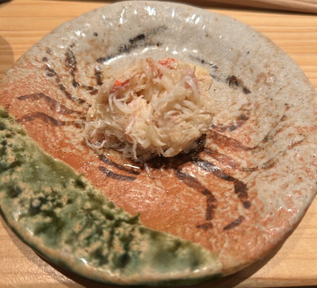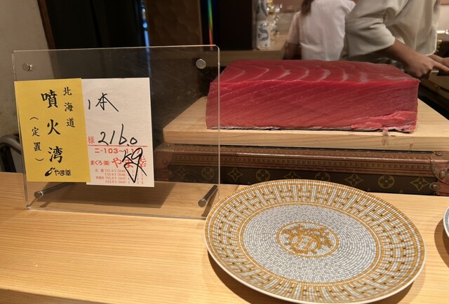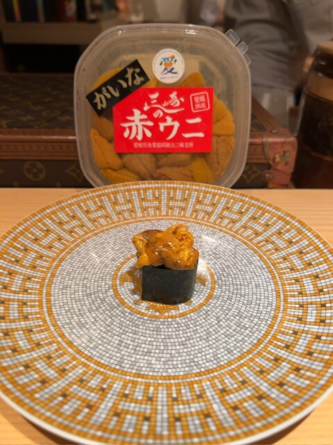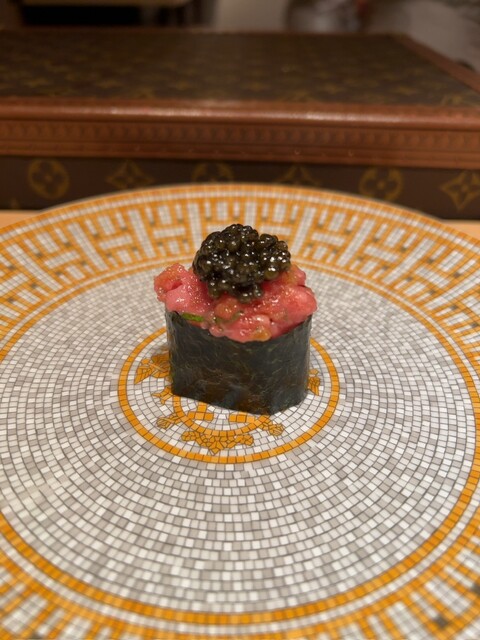 メイチダイ、牡蠣(または赤雲丹)、毛蟹、シンイカ、バフンウニ、黒あわび、さんま、水菜のオリーブオイル/塩昆布、太刀魚/山わさび、新イクラ、岩もずく、からすみ餅、中トロ、赤身の漬け、松茸の土瓶蒸し、ねぎとろキャビア軍艦、タコ、車海老、金目鯛、鮑の肝ご飯、鯵、雲丹軍艦、雲丹、鰻キュー巻き