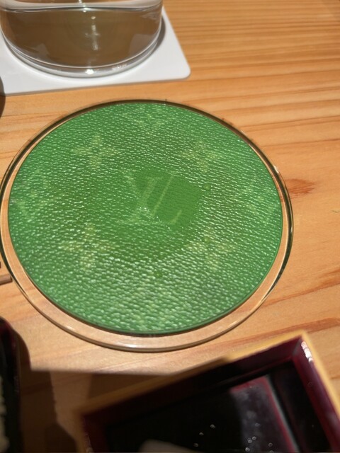お店の入口は少しわかりづらく、探してようやく入店。外観の素っ気なさに反して、店内には華やかな世界観が広がっていました。テーブルにはエルメスのお皿やヴィトンのコースターなど、ハイブランドのアイテムが並び、非日常感を演出。ブランドに疎い自分は指摘されるまで気づかず、勉強不足を痛感。