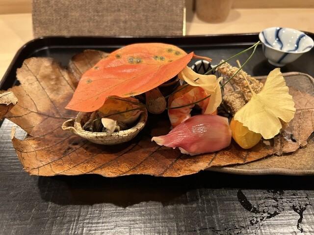 八寸 金柑、めひかり、青羽太、高山ごぼう、なまこ、車海老、虫海老、茗荷の寿司