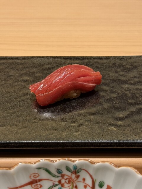 麻布台ヒルズの地下、スタイリッシュかつ静謐な空間。照明は抑えめ、カウンター越しの職人の背後に控える落ち着いた内装が、まるで舞台装置のように客を包み込む。洗練と威厳が同居する、最高峰の鮨の儀式にふさわしい場である。