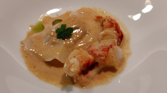 最近は必ず出てくるオマールの料理。今回はラビオリと合わせて出来ました。濃厚なビスクソースが旨い!
