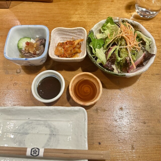 ☆先付けは3種類、サラダ・キムチ・和牛テール甘酢