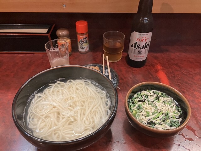 運良く空いてましたが、すぐに満員になりました。釜揚げうどんといなりを注文。麺は細めで、ゆず風味の独特なつけ汁で病みつきになります。特にお酒を飲んだ後はちょうど良いです。