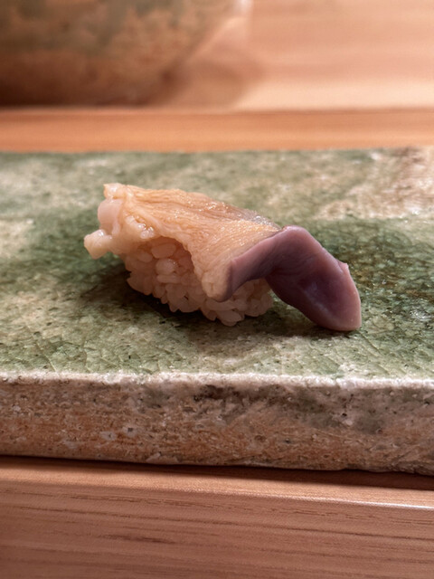 下駄、と言うよりそのまま鮨台と言うべきか、こだわりの織部焼きや様々なおちょこといい、食器にもこだわりあり!