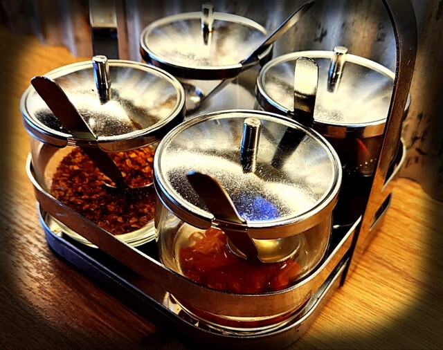 机にはいくつかのタイのソースとスパイスがあり、途中で味変もできます。