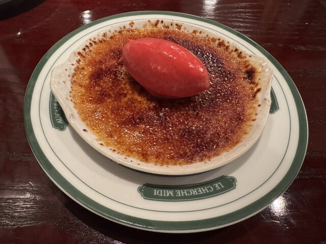 加賀棒茶のクレームブリュレは上に甘酸っぱいフランボワーズのジェラートがのっており、加賀棒茶のクリームとマッチしてさっぱりいただけます。うまい!