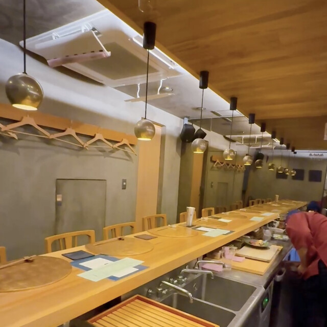 重厚感ある一枚板の木目を活かしたカウンター席が目を引く木の色合いを基調にした上質な雰囲気です。