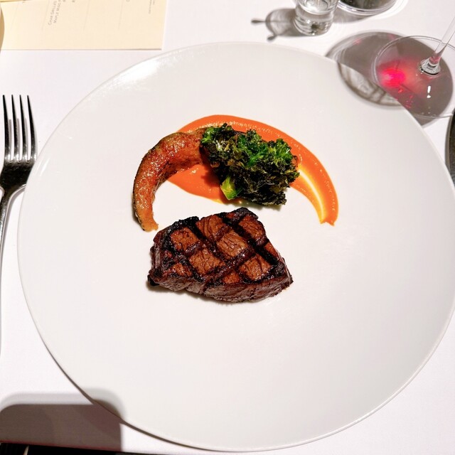 国産牛フィレ 120g、南瓜のメープル味噌風味、京人参のピューレ、プチベール、赤ワインソースorペッパーコーンソース