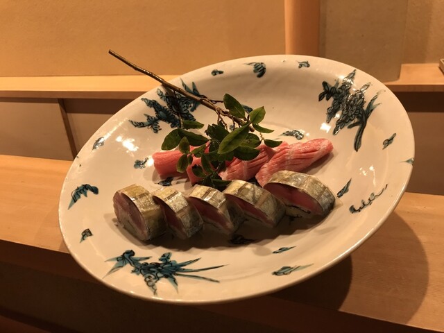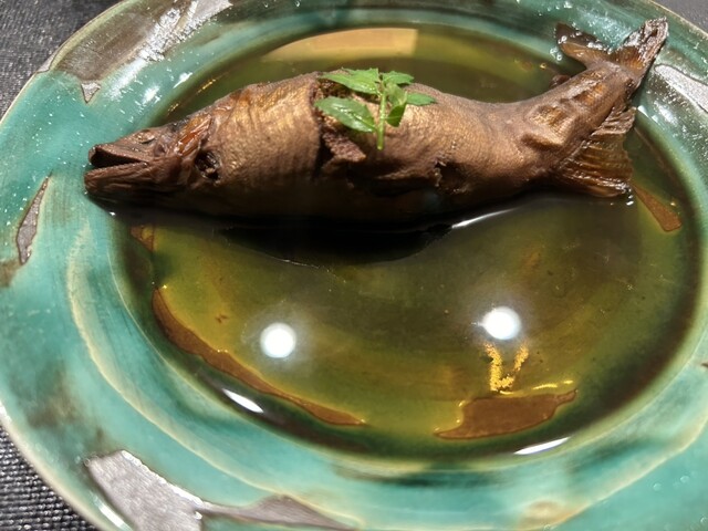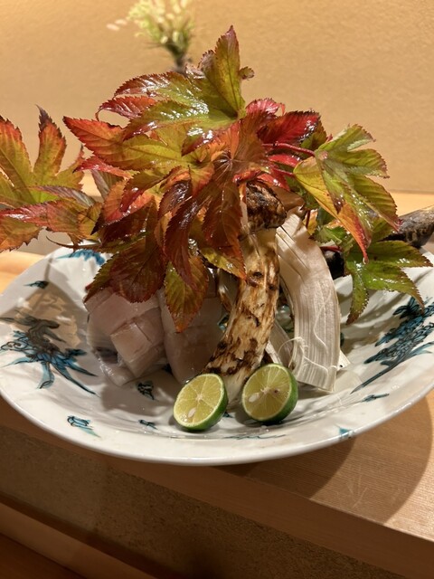 いつも素晴らしい鈴江…その時期、最も旬で極上の素材を、大将の確かな技と、気品ありつつも穏やかで温かい心尽くしのおもてなしにより…究極の形でいただけます。秋の鈴江の主役はやはり地元産松茸…期待に心躍りつつ、まずは天然鮎から…綾部産の身の厚い子持ち鮎をほうじ茶煮でいただきます…いやいやなかなかお目にかかれない上品で贅沢ないただき方…鮎の風味を残しつつ、煮崩れずこの姿を保てるのは活だからこそ…初っ端から感動です。次にお刺身…いずれも大きく見事です…特に今朝淡路で上がりたての約1.6キロの鯛は、あっさりながら程よい脂と上質な旨味に溢れています…もちろんマグロも赤貝も素晴らしい!どれも塩で充分…一言、至福です。焼き鯖の碗物は珍しい…きっとこの鯖の旨さ全てを余すことなく堪能するには、これがベストなのでしょう…丁寧な下ごしらえのお陰か意外にもあっさりとした仕上がり…新鮮な鯖からの上質な出汁に旨味が染み渡り、生姜と抜群の相性です…