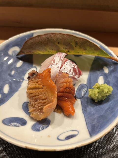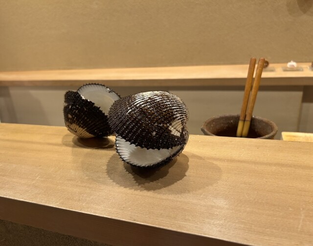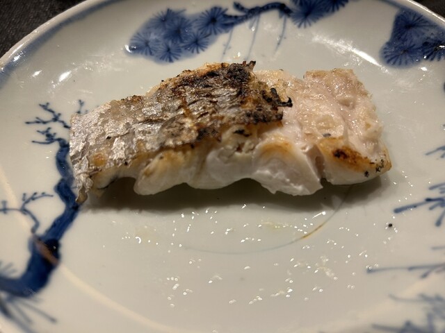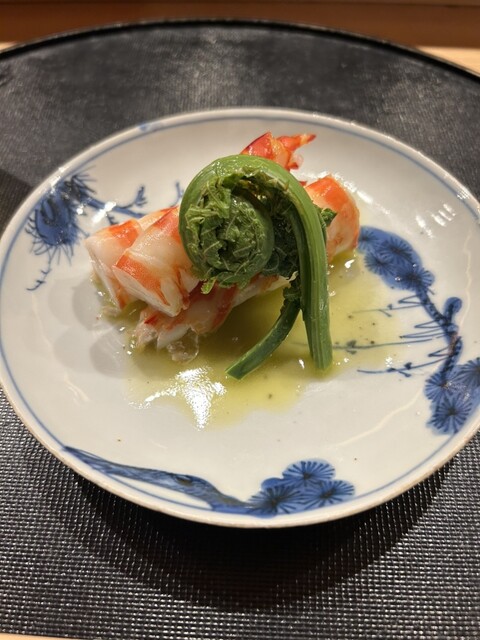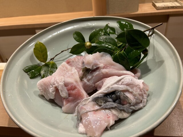 まさにスタートから津居山産のズワイ…そして河豚へ…なんとたっぷりで厚切りの身や皮を軽く大根おろしなどで味付けたものに…白子がかけられていて…未体験の外観や極上の美味さに驚きと感動が絶えません。椀ものは徳島産の見事に大きな蛤、さらに春を感じさせる筍は、山城産…何と伊勢海老とそのミソ出汁とでいただくという斬新な組み合わせ…見た目も美しくその発想を産み出す店主の感性にまさに脱帽です…メインは焼きフグ…天然物6キロの河豚の身はありえない大きさで、これを店主が丁寧に焼いてくださり、いただく身の新鮮さや弾力、ぷりぷり感にまた驚き、淡白ながら上質な旨さに唸るばかりです!ラストは大間のマグロに淡路産の貴重な赤ウニや赤貝の握り…言葉では言い尽くせない贅沢な〆となります…