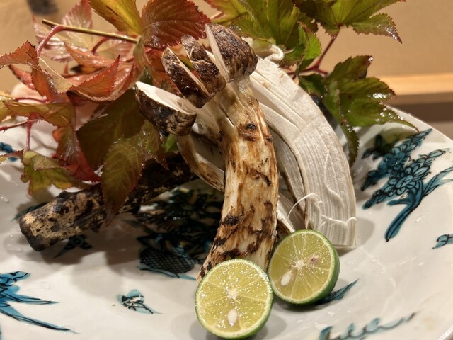 さていよいよ焼き松茸…まず盛りが美しい!松茸はあの貴重な京北産、見事な大きさ、そして新鮮で芳醇な香りです…皿に一緒に盛られてるのは岩屋産太刀魚…6.8キロ、2mの大物です…大将自ら丁寧に七輪で炭焼きし供してくれます。太刀魚はフワフワ、そして松茸の何と瑞々しいこと…焼くと水分が漲り更に香りが立ち、ずっと眺めていたい気分です!自家製ポン酢を用意してもらいますが、そのままで…秋の主役を存分に味わう最高の贅沢を五感で満喫します。さらに青森産のフカヒレの姿煮も美しく美味な逸品。〆は時鮭の炊き込みご飯に溢れんばかりの筋子が…これまたビジュアルから美しく本当に美味しい…時鮭の旨味に香ばしさと筋子のプチプチ感のバランスが絶妙かつ絶品です!残った分はお土産で…綺麗に包んでいただきました。
