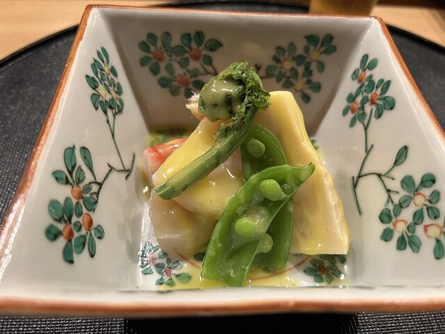 さて桜も咲きだした春のこの時期、今日の先付けは…おお!なんと春らしく見た目が優しく美しい!山城産の若竹と淡路産の車海老そしてタイラギ貝の貝柱を何とオリーブオイルで和え、サヤエンドウとこごみが添えられています…まさに春を感じる逸品…若竹はエグ味なく何とも甘く上品…またオリーブオイルは小豆島でも貴重な一番絞りでいただくという贅沢さです。向付けは桜鯛に赤貝…いずれも淡路は福良産…とにかく桜鯛が立派…1.3キロ級とか…身の厚さに締まり、脂ののり、弾力全てが素晴らしい…赤貝も新鮮で味、歯応えとも極上…貝自体を見せてもらいましたが、大きさも本当に立派です。続いては何とフグ…身と遠江(とおとうみ(フグの身と皮の間のゼラチン質))の煮物です…フグは淡路産5キロ級の天然もので、利尻産の昆布だけですが、フグのいい出汁がたまらなく上質で旨味溢れています。白子も美しく立派…とてもプリプリし濃厚…新鮮な天然ものだけに箸を入れても崩れません!そして鈴江のスペシャリティ…大将自らによる焼物です♪今日はマルアナゴにとりがい…淡路島は尾崎漁港で上がったもの…レモンと山葵で仕上げてもらいますが、焼くと甘さと旨味が凄い!これを塩あるいは自家製ポン酢でいただきます。塩もいいがポン酢が抜群…極上のお味です!