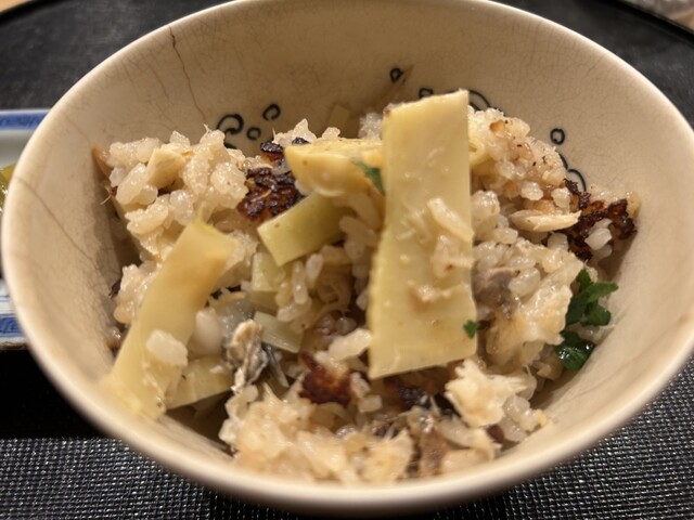 そしてアイナメと若竹の揚げダシ…これがまた絶品!アイナメの頭と利尻昆布、そして鰹で取った出汁が素晴らしい!アイナメは淡白ながら上品で旨味をしっかり感じます…好物の筍も出汁との絶妙な相性がお見事です♪〆は桜鯛の頭で出汁を取った若竹ご飯!筍の味わいがしっかり味わえ、鯛の身とのハーモニーが見事です…お供の花山葵の醤油漬け、そして利尻昆布の佃煮も本当に良く合い美味しいです。
