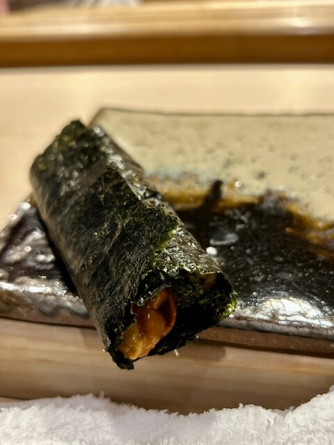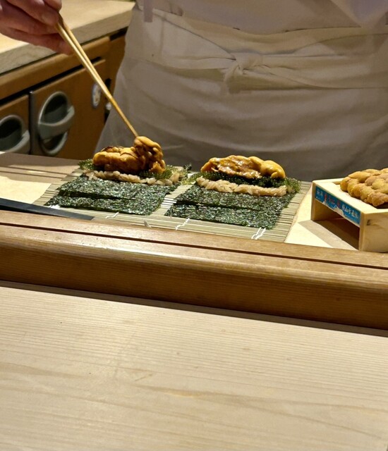 梅肉の茶碗蒸しから始まるコースは、いずれも濃厚な美味に溢れ、熟成の技が光る逸品揃い!立派なクルマ海老(マキエビ)を撮り忘れ残念ですが、まさに計算された圧巻のラインナップです♪特に握りは各ネタの旨味を最大化するシャリがお見事…粒立ち、口の中でほどける食感や程よい温感、そしてネタとの絶妙な調和を生み出す赤酢と米酢の使い分けによる酢具合…とにかく一貫一貫のバランスが素晴らしい!キスの昆布締め、そして見るから美しすぎるコハダときて…豪華雲丹巻き!雲丹と海葡萄の食感、雲丹の濃厚な旨味の引き出しがお見事な逸品です!熟成技の極み、アラとヒラメ、そしてさっぱりポン酢のワカメとアイススプラウトを挟み供される毛蟹&キャビア、そして分厚い蒸し鮑に雲丹&イクラがたっぷりまぶされた…旨味と歯応えのシンクロが見事な逸品が続き圧倒されます!このあと北海道産大ズワイ蟹をいただく辺りは酒との相性が抜群…幸せが込み上げます!閖上の赤貝も季節ものの秋刀魚も素晴らしい!さらになんとも身厚で柔らかく旨味溢れる宍道湖産天然ウナギの贅沢なこと…