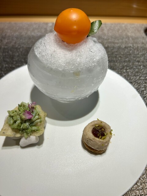 いよいよ中盤…「黒鮑&トリュフ&かぶら」〜6時間かけて蒸された鮑はとても柔らかく…噛むほど奥深い磯の旨味が溢れて…トリュフソースの立ち上がる魅惑的な香りが、鮑の持つ「海のミネラル感」を引き立て、料理全体に圧倒的な高級感と深みを与えています♪さらに「愛媛からの贈り物」は宝石箱に…中から愛媛みかんポンゼリーでコーティングされたフォアグラが…これは素晴らしい演出!そしてフォアグラの濃厚なコクと、愛媛みかんの爽やかな酸味のマリアージュが織りなす極上の味わい…まさに五感で味わい楽しむ絶品です!