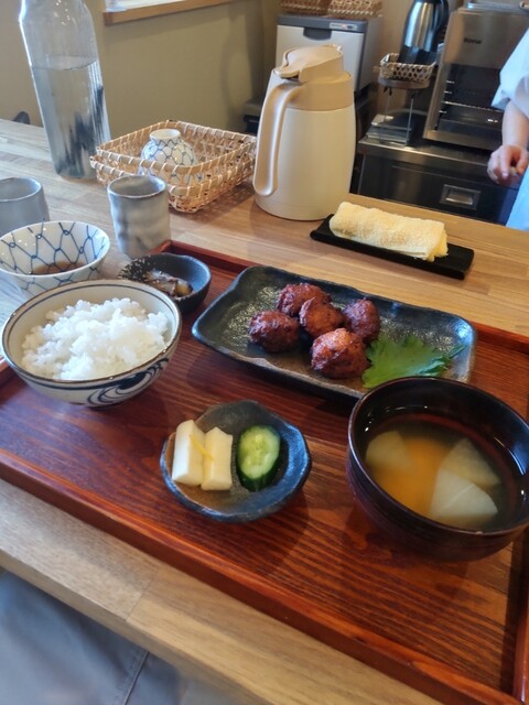 日替りでメインが2種類あり。私はイカの揚げ団子。娘は鶏むねチャーシュー。おばんざいと、土鍋ご飯、味噌汁で1450円。麹がきいているのでしょうか、どのお料理もしっかりと味がするのに濃すぎず、ご飯に合います。食後の満足感が高い。イカ団子、フワフワで感激。