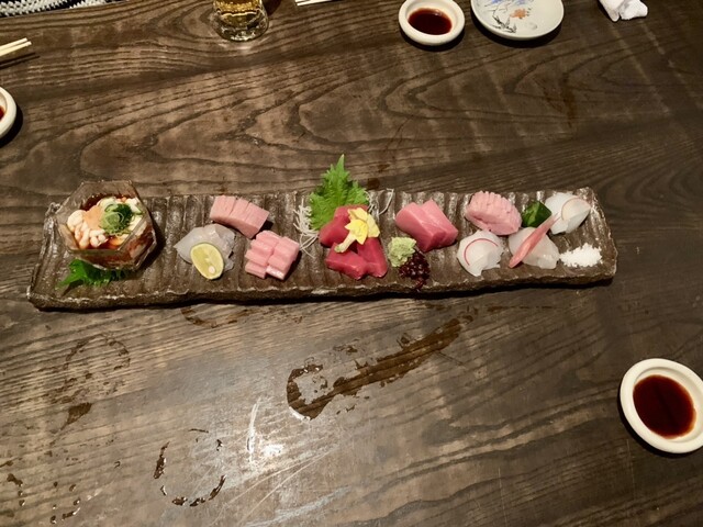 ここから刺盛り大。人数でコンテンツ調整かと思われます。琵琶マスがアクセント。ここは地酒の忍者、淡麗辛口でスッキリと。