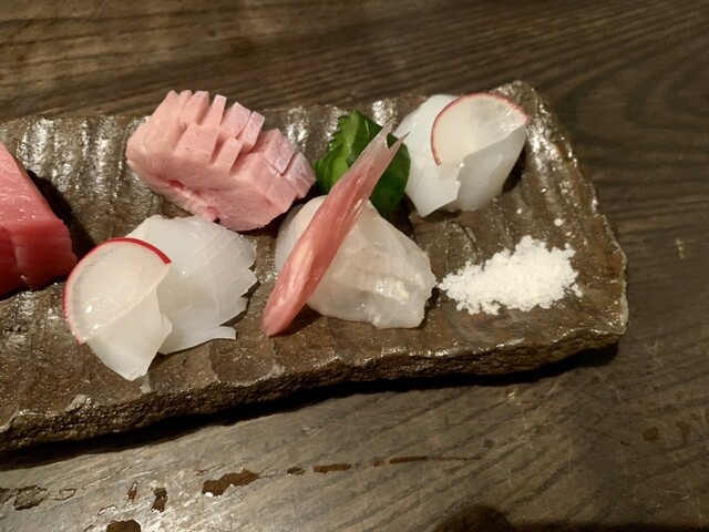くちゃくちゃしゃべってると刺盛り。タチポン付きです。全て4切れずつで恒例のじゃんけん不要。ヨコワおいしいです。モンゴウイカは塩で。甘いです。