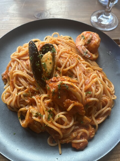 で、これが美味しい〜。濃いめでソース沢山の好きな味。具もアサリ、イカ、タコ、帆立、ムール貝、エビが入ってました。