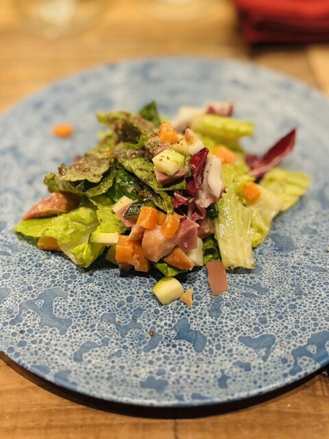 コースで、前菜の盛り合わせ、チョップドサラダ、鴨、和牛、ミートスパゲッティ、デザートの流れで、全て美味しく頂けました。
