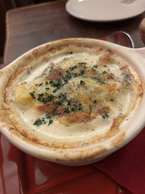 今回はオードブルの盛り合わせ、キッシュ、またグラタンを頼みました。どれも美味しかったです。季節のキッシュは、海老とブロッコリーとオレンジズッキーニという面白い組み合わせですが、良く合い、見た目も綺麗でした。また、グラタンはじゃがいもとブルーチーズなので、ブルーチーズ好きな私にとっては、あの臭さが味わえて贅沢でした。バゲットは有難いことにお代わりができるので、グラタンに付けて頂きました。アヒージョを頼む方にも合いますね。