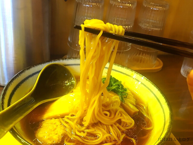 着丼したラーメンは、黄金色のスープとは一転、深い琥珀色。