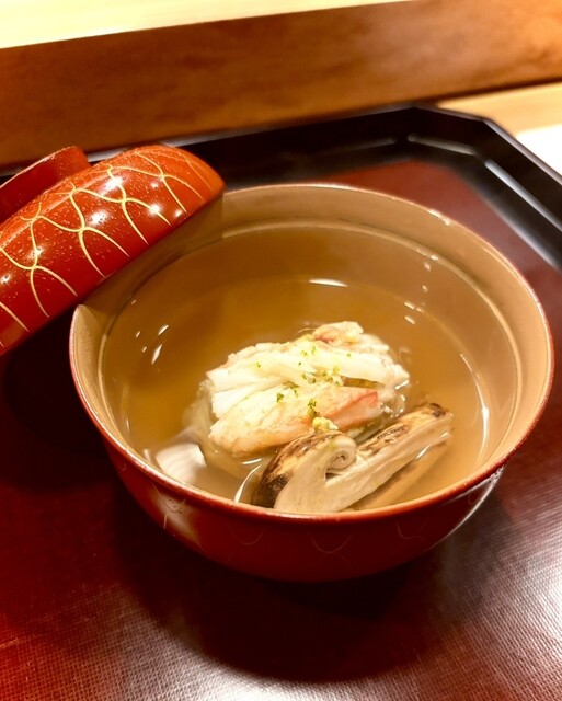 贅沢にカニの身、カニ味噌、松茸の入ったしんじょうはレンコンのサクサク具合と松茸の香りがたまらない一品