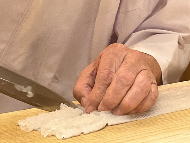 はもの落としは目の前で骨切りしたものを梅のシャーベットで。