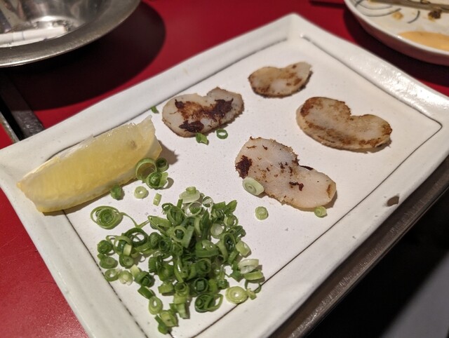 華大さんもオススメとのことで頼んだタイラギ。お店の人いわく福岡の男はこれで芋ロック2杯飲めるとのことですが、私も飲めそう。薄くて小さなホタテみたいなものですが、たしかに、するめのようにずっとモグモグしていたい。塩気が強いというよりも出汁がジワッと感じられる絶妙おつまみ。
