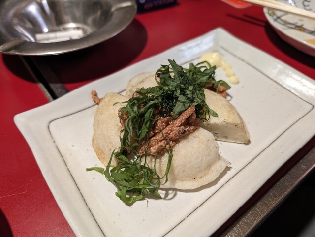 明太モチは、頼んでみたら見た目が似ていたのでモチモチ餃子と被るかと思ったけど、明太モチの方が外カリッとしていますね。大葉もたっぷりで嬉しい。